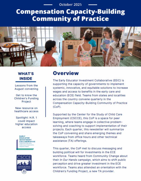 In 2025, The Collaborative launched the Compensation Capacity-Building Community of Practice, led by the Center for the Study of Child Care Employment at UC Berkeley. The community of practice brings together a small group of state and local teams working to advance ECE workforce compensation through innovations in financial systems, data infrastructure, and agency collaboration. This partnership fosters shared learning among participating teams and highlight how their efforts can inform compensation strategies nationwide. It supports peer learning, expert guidance, and collective problem-solving to accelerate progress and inform the broader field.
